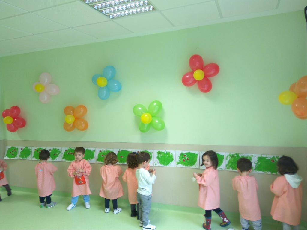 Después nos juntamos las dos clases de 2-3 años y decoramos las paredes con grandes rosas de colores hechas con globos ¡qué bonito nos ha quedado!