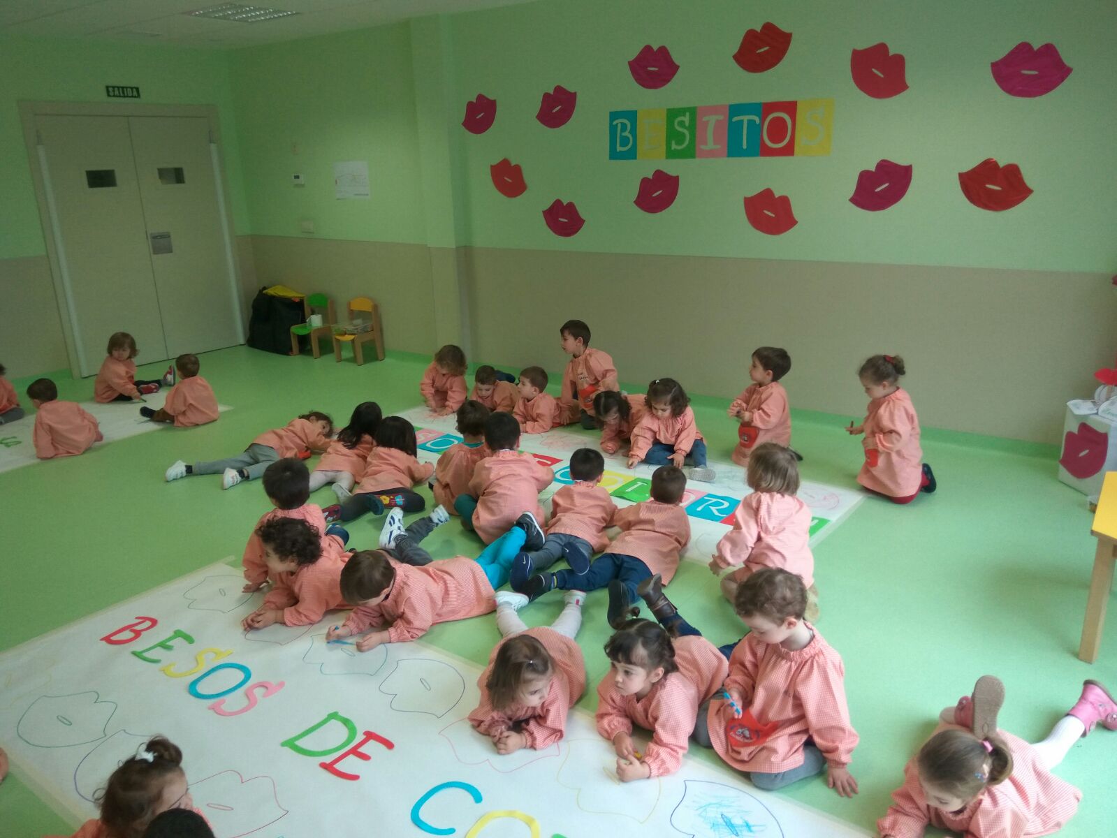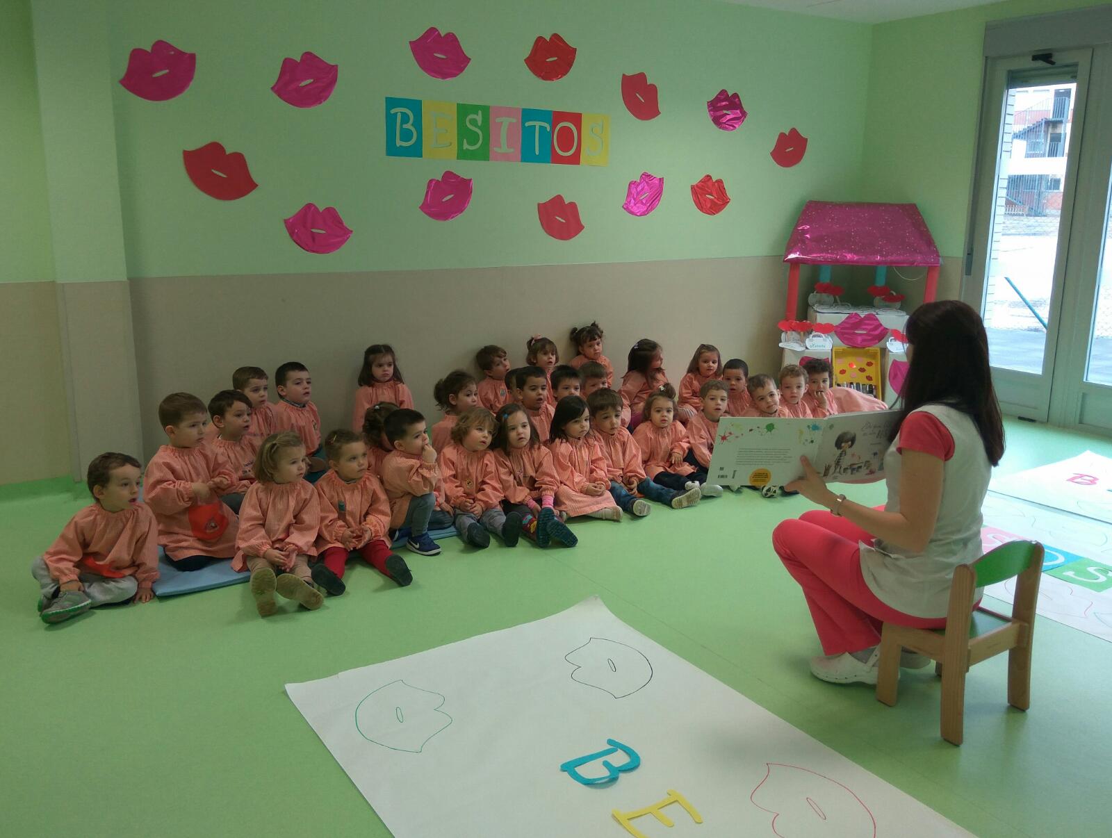 A primera hora de la mañana todos los alumnos de la escuela infantil se dirigieron al aula de actividades, una vez en grupo leímos el cuento “besos de colores” donde una niña iba describiendo los diferentes besos, una vez terminados éstos estaban pintados en murales con el título en grande del cuento, cada niño/a coloreó con rotuladores un beso.