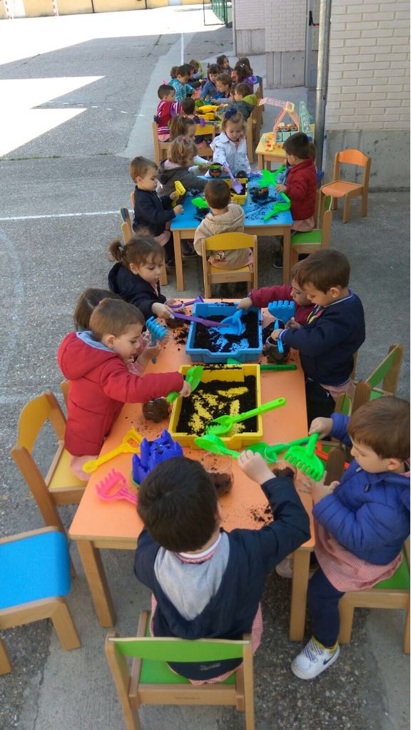 Después de la visita al huerto, nos disponemos a hacer la actividad de la siembra. Lo hacemos en botellas de plástico recicladas echando tierra y semillas con palas que hemos traído de casa y una vez sembrado cada día lo regaremos para ver que preciosa flor de primavera nos sale.