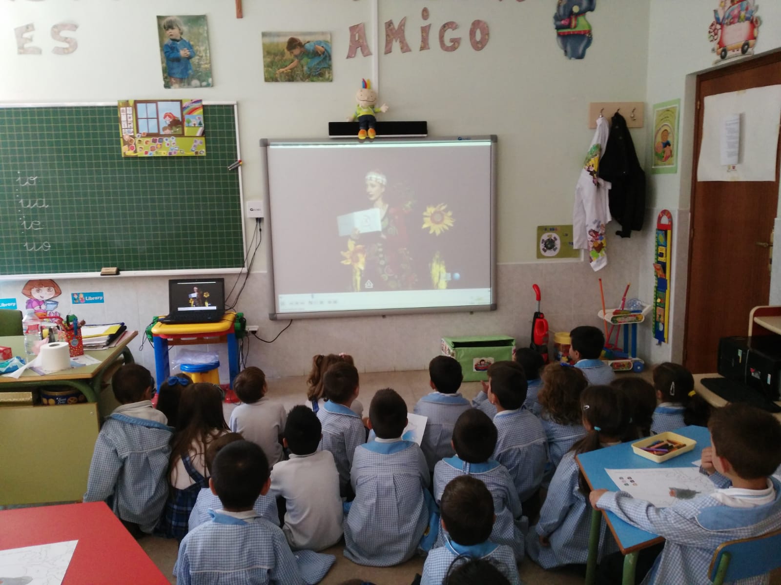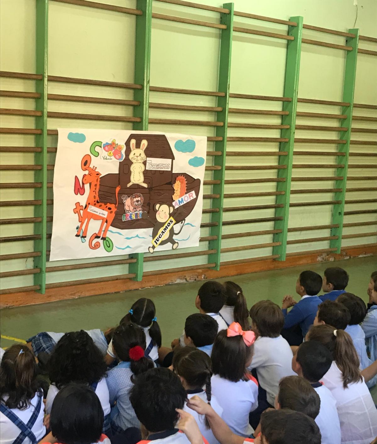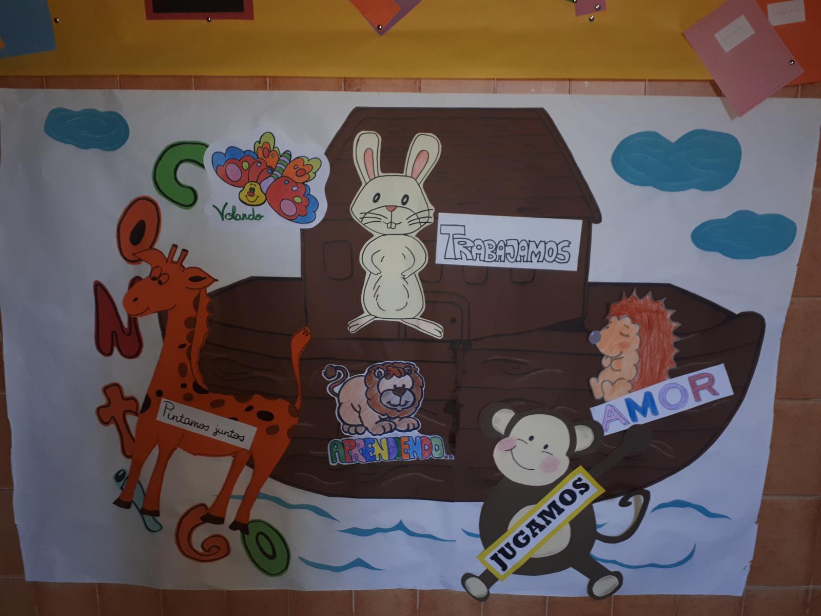 En E.P los alumnos de 1º a 3º los alumnos escucharon “La historia de Noé”, mientras plasmaban el arca en un bonito mural.