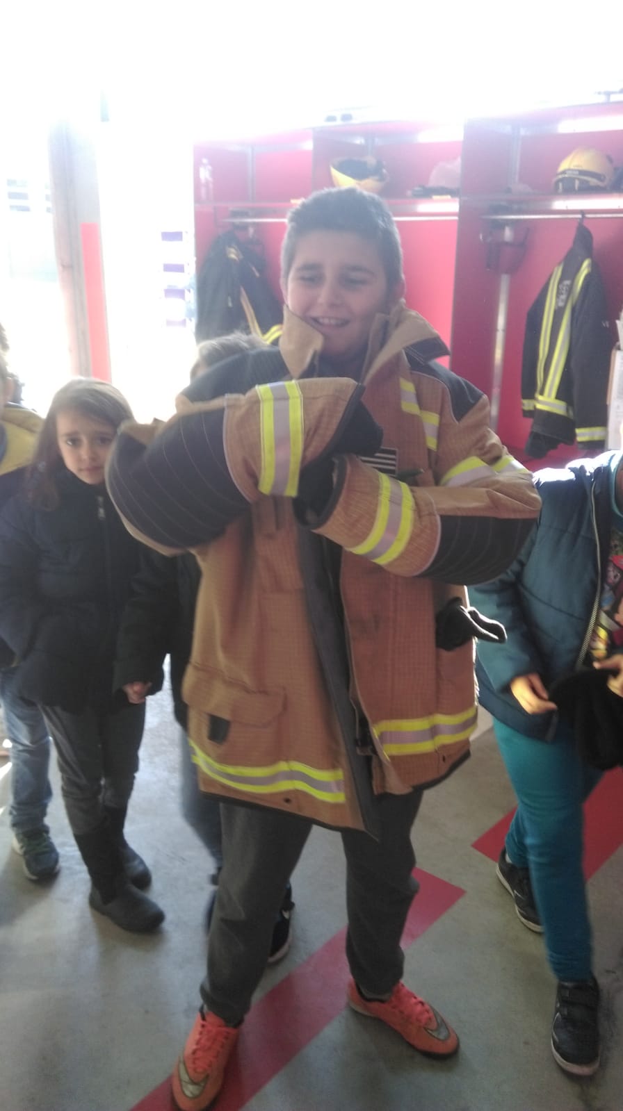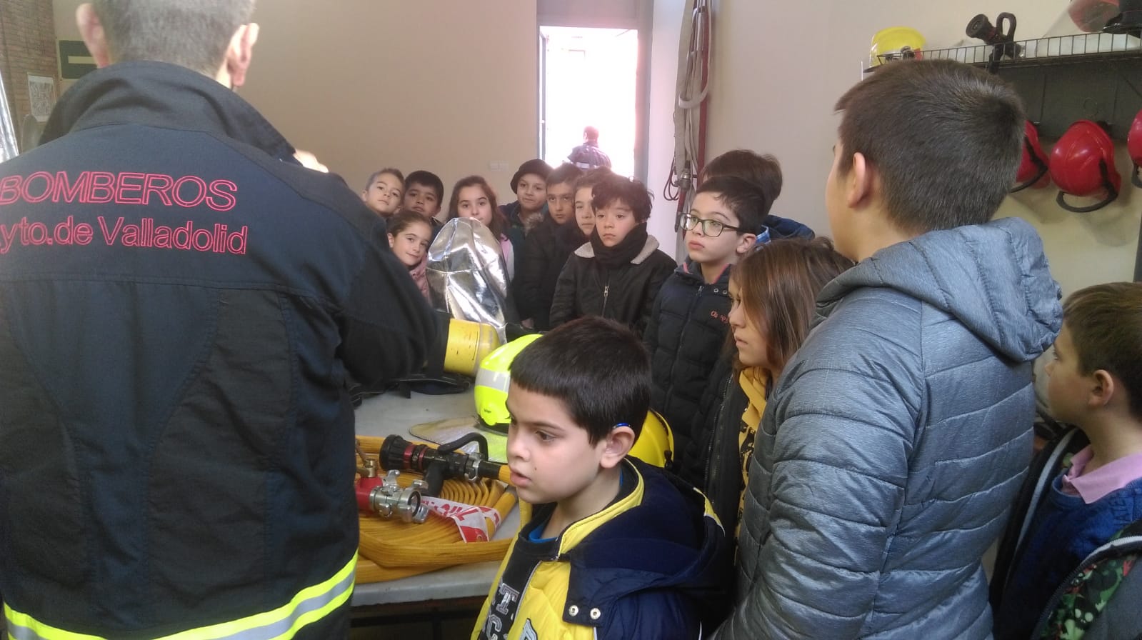Los bomberos del Parque que estaban de servicio, nos enseñaron la ropa que visten: cascos, pantalones, máscaras, trajes, etc. Uno de ellos, Antonio se puso el traje, el casco y la bombona de oxígeno.