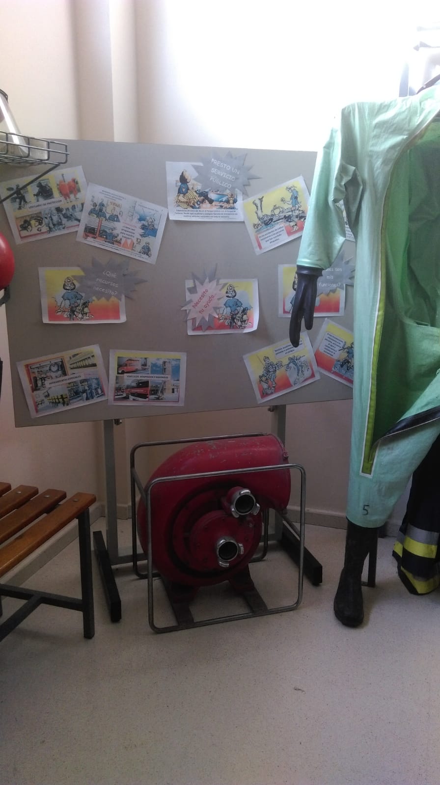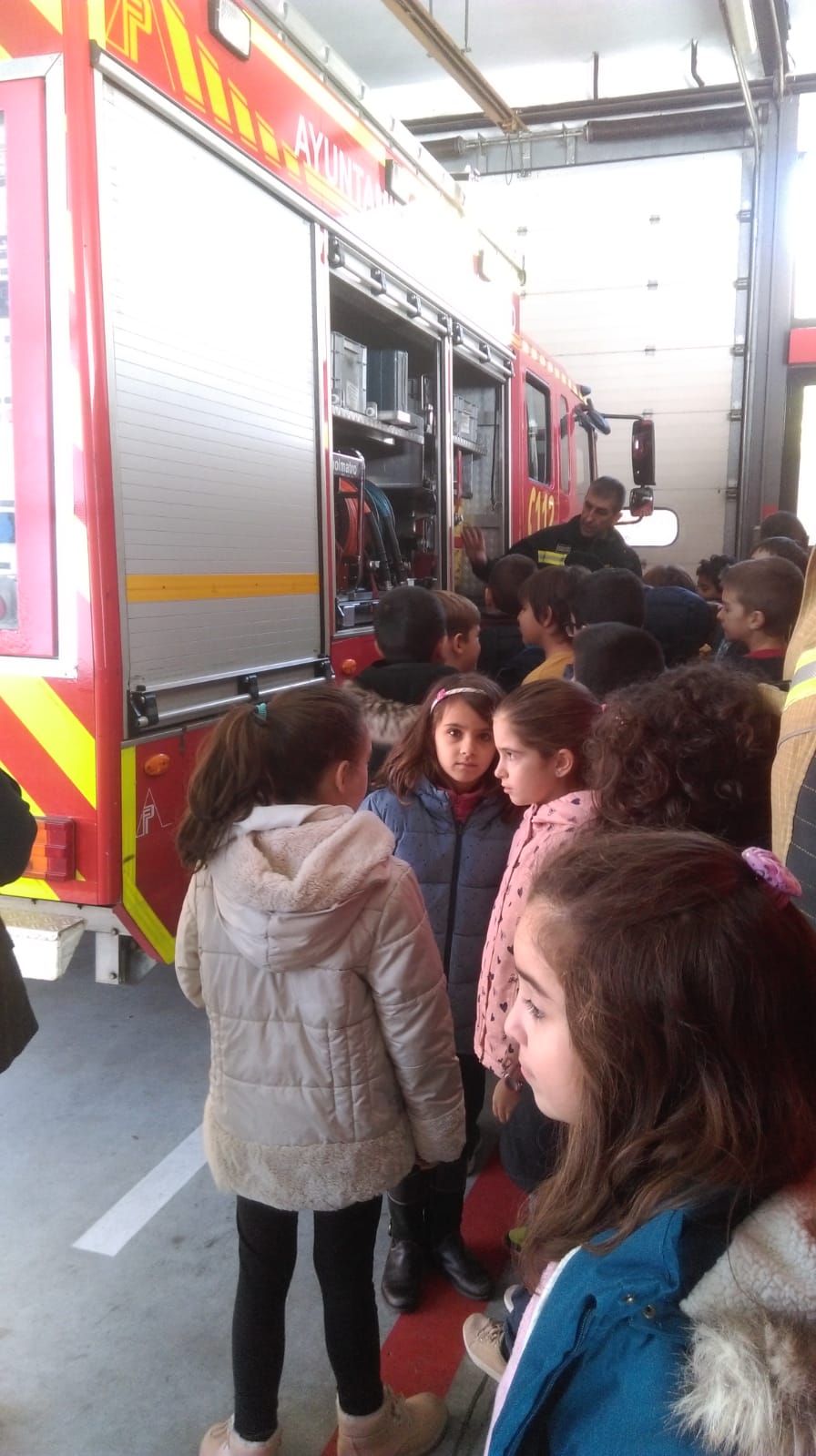Nos dejaron montar en los camiones de bomberos y después fuimos a una sala. Tuvimos que subir muchas, pero muchas escaleras y vimos un video donde pudimos ver lo que tenemos hacer cuando hay un incendio. Al final, nos dieron un papel para buscar los errores que no se deben cometer cuando hay fuego y un camión de bomberos para construir en cartulina