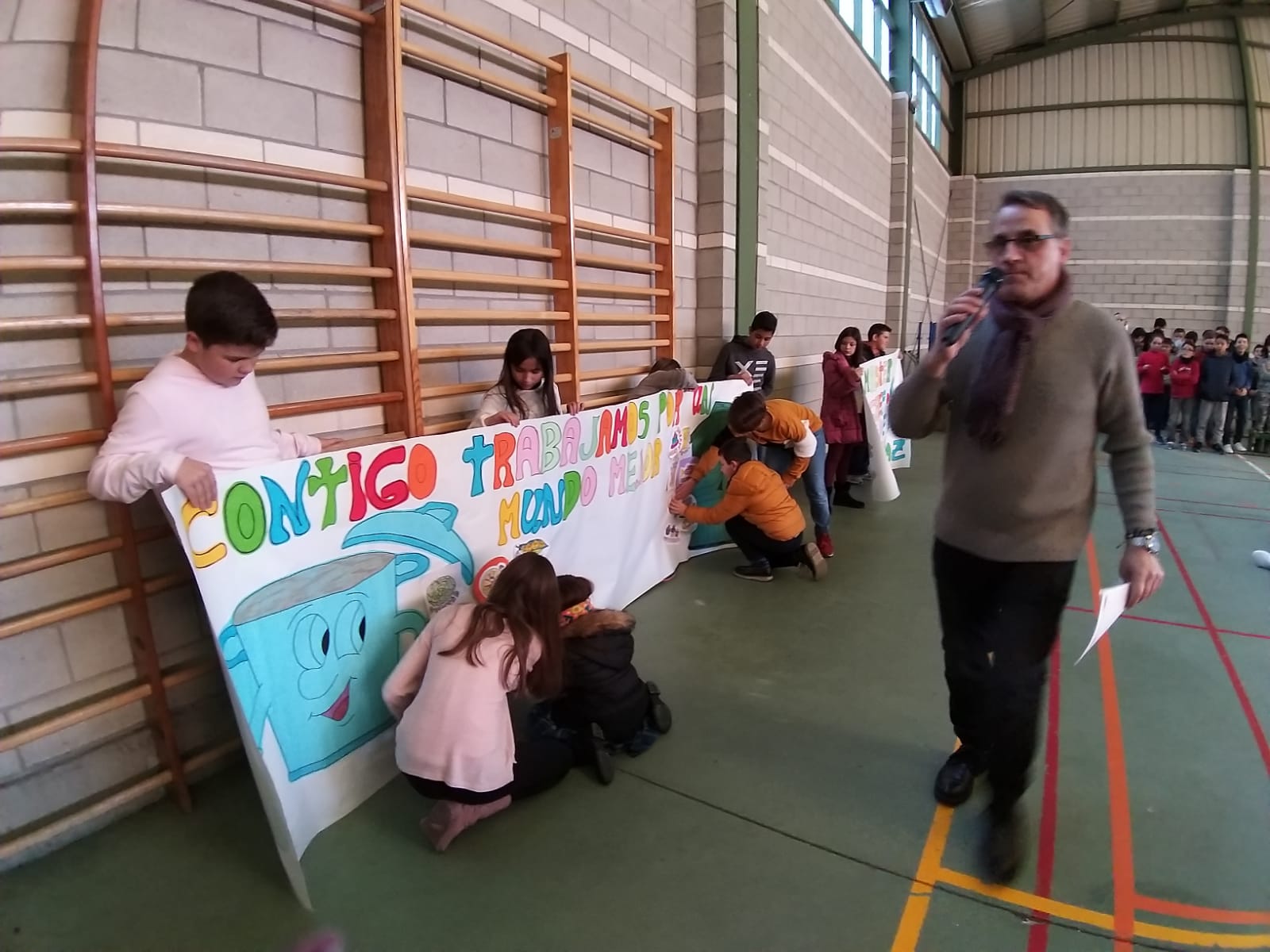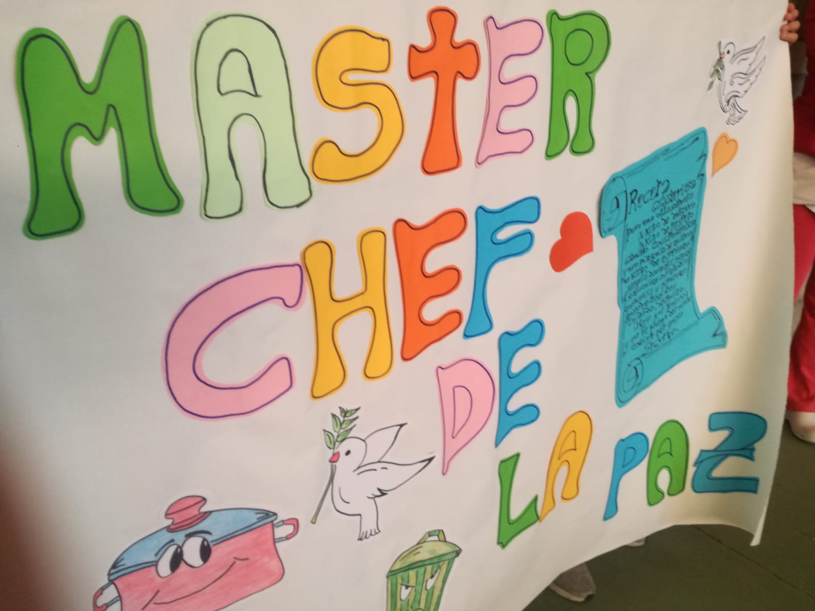 Los alumnos del colegio Ntra. Sra. del Carmen celebramos el Día Escolar por la No Violencia y la Paz, participando en la actividad “Masterchef de la Paz”, cada curso recibió un valor que colocó dentro de la olla y un contravalor que se tiró al cubo de la basura, realizando así entre todos el mural “Contigo trabajamos un mundo mejor”, mientras como música de fondo escuchamos la canción de los “Celtas Cortos” “Tú cuentas.