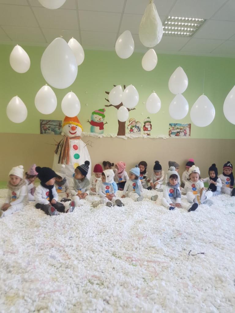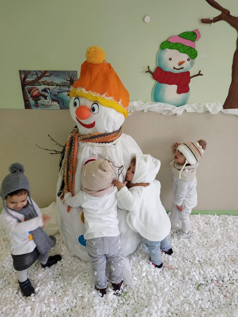 Los niños jugaron con la nieve artificial, los globos y el muñeco de nieve. ¡Les encantó!