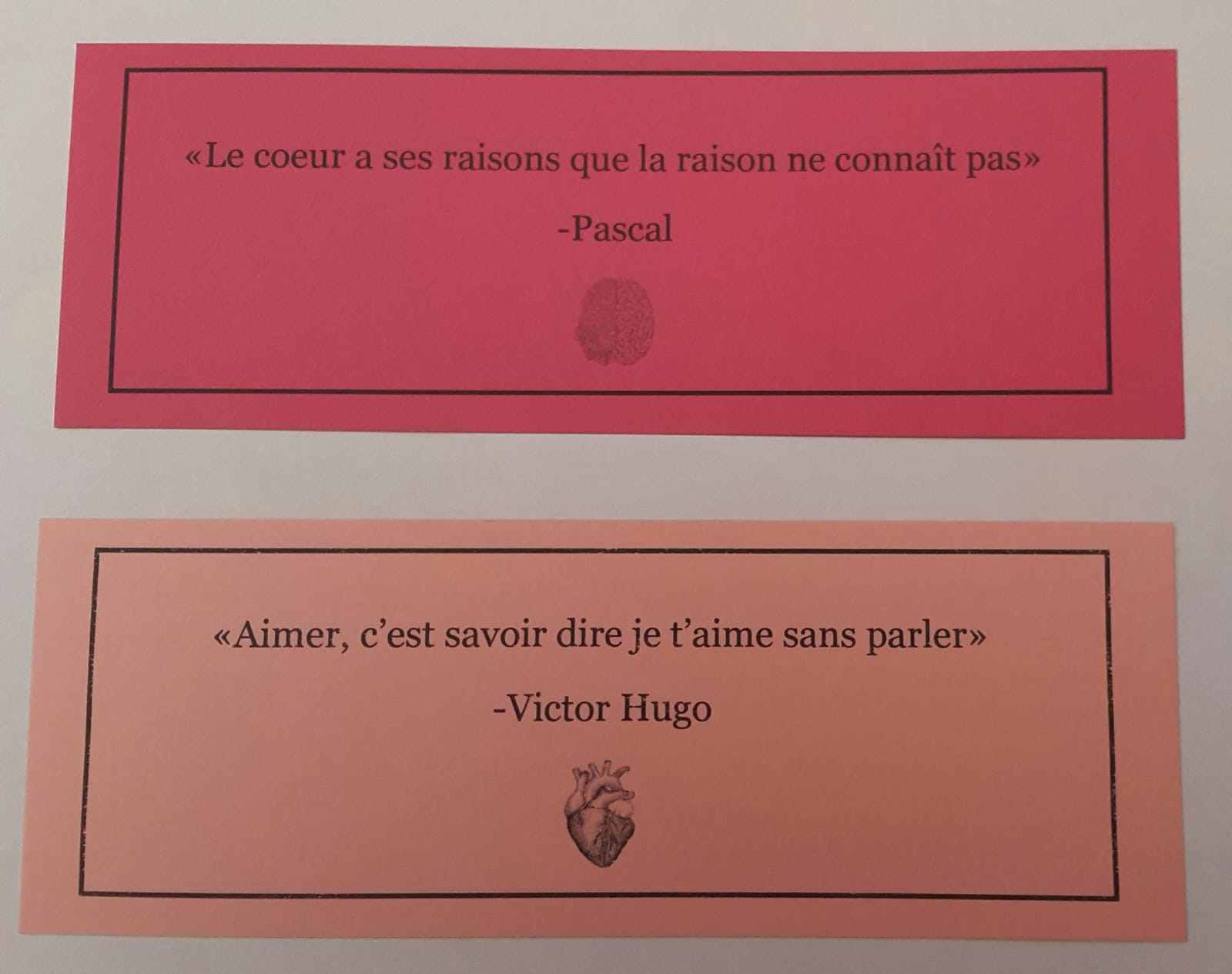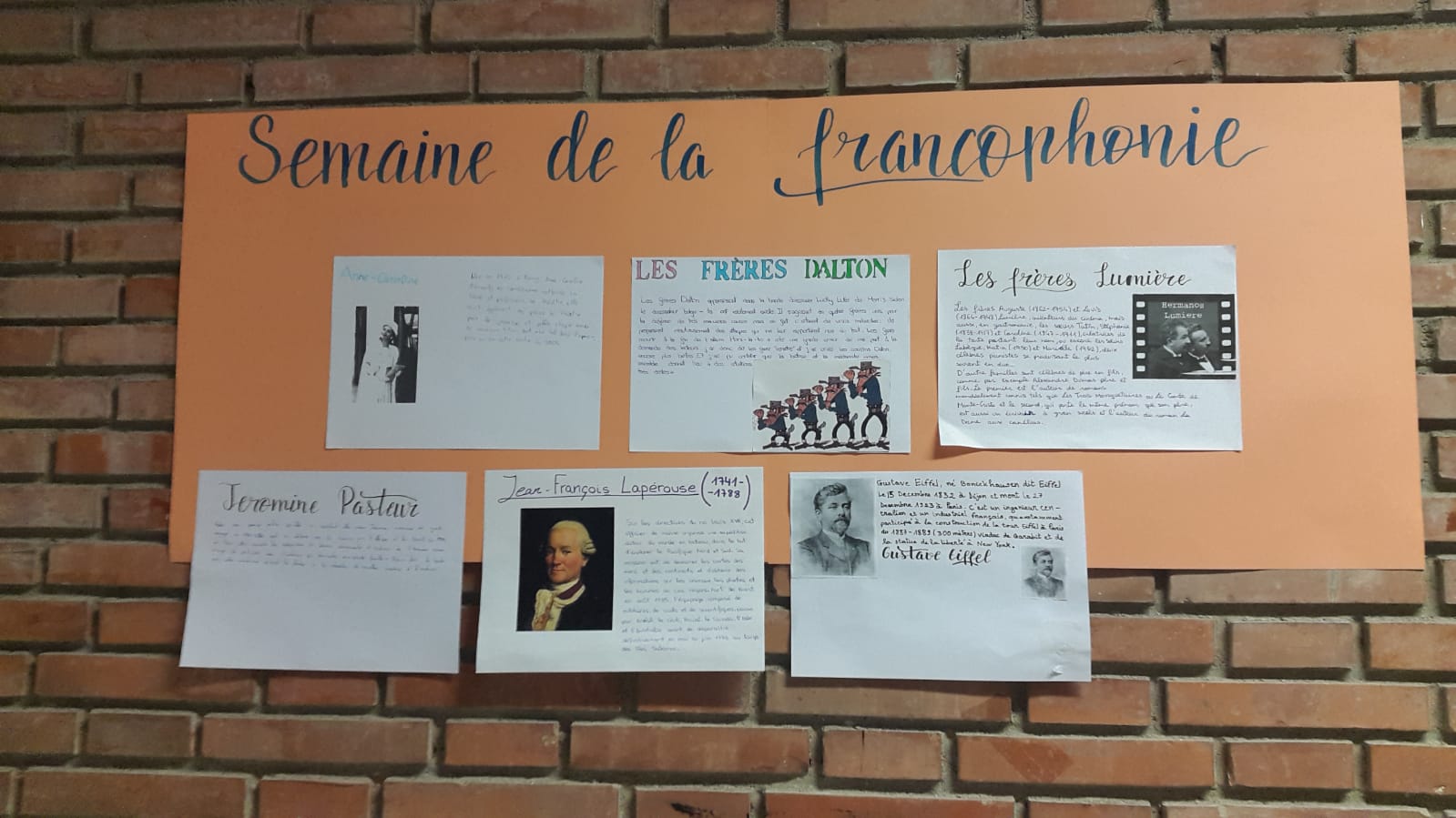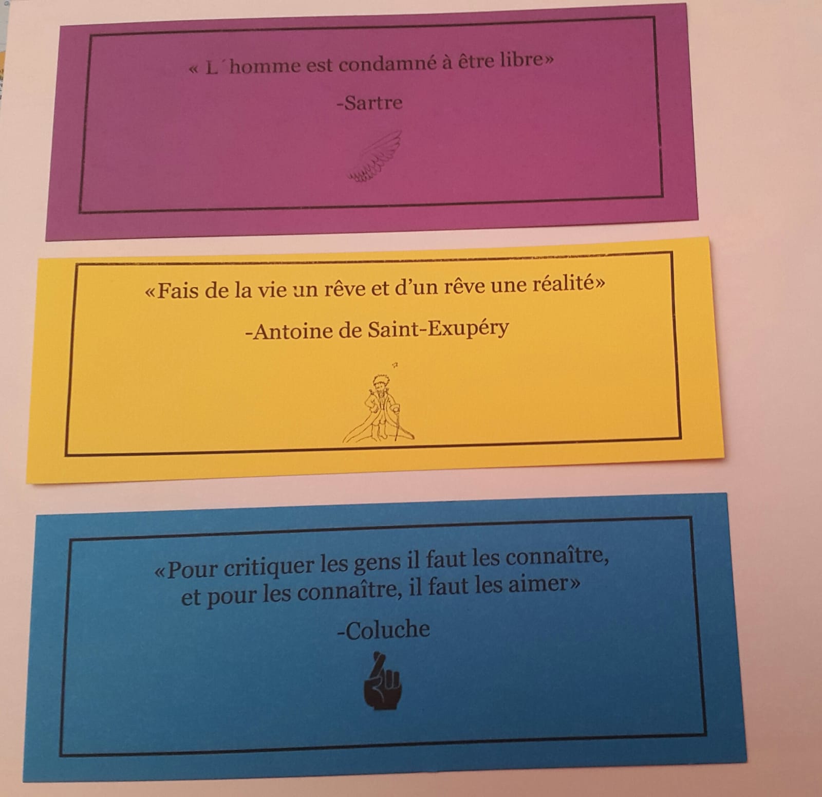 Une élève de 2e BTO a designé de différents marque-pages, sur lesquels elle a dessiné un petit motif et écrit une petite phrase remarquable d’un personnage célèbre, tel comme Sartre, Antoine de Saint-Exupéry, Coluche, Pierre Curie, l’Abbé Pierre, Rousseau, Pascal ou Victor Hugo, qui ont été distribué à tous les professeurs et élèves du collège comme cadeau-souvenir de la francophonie.