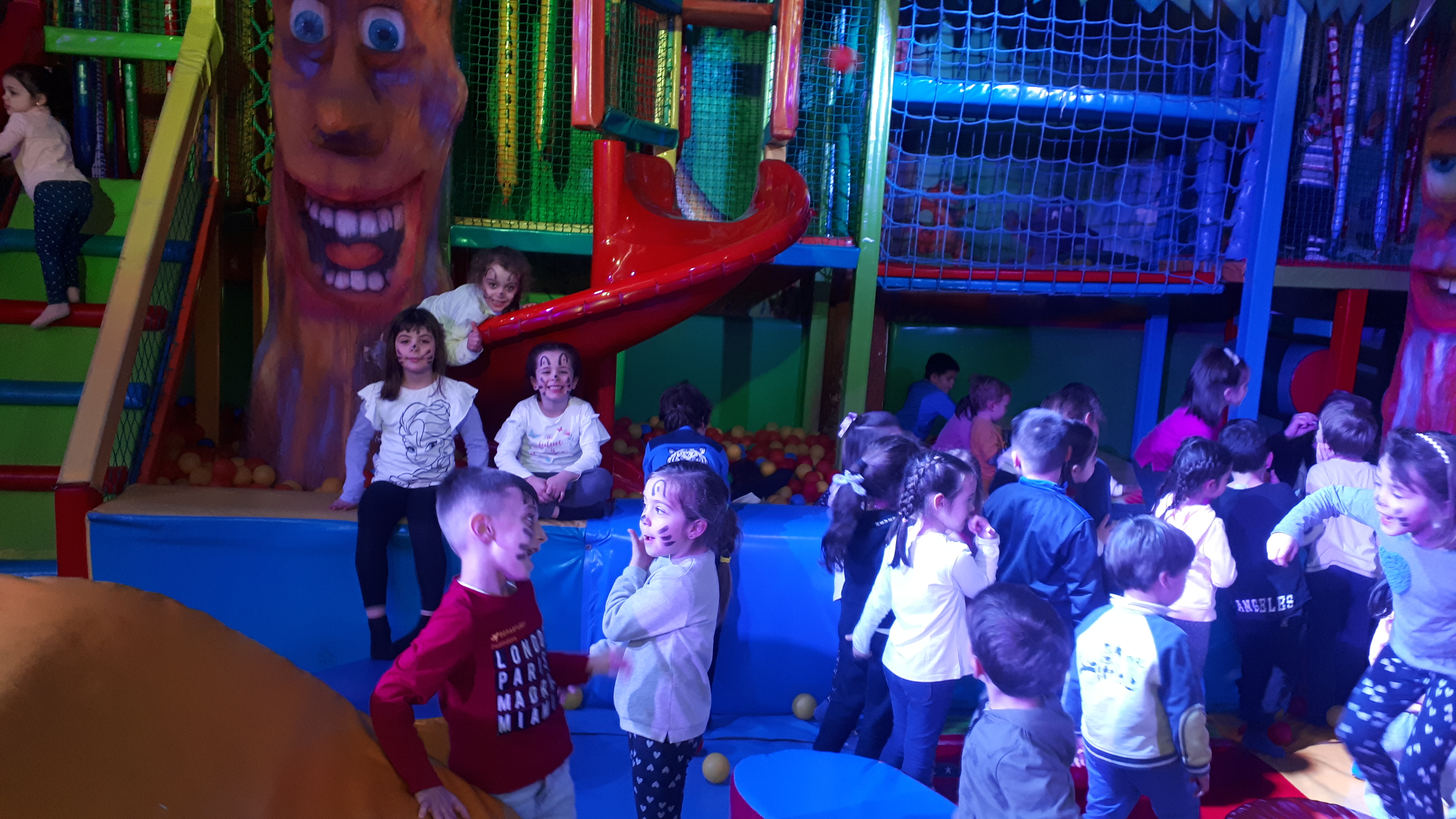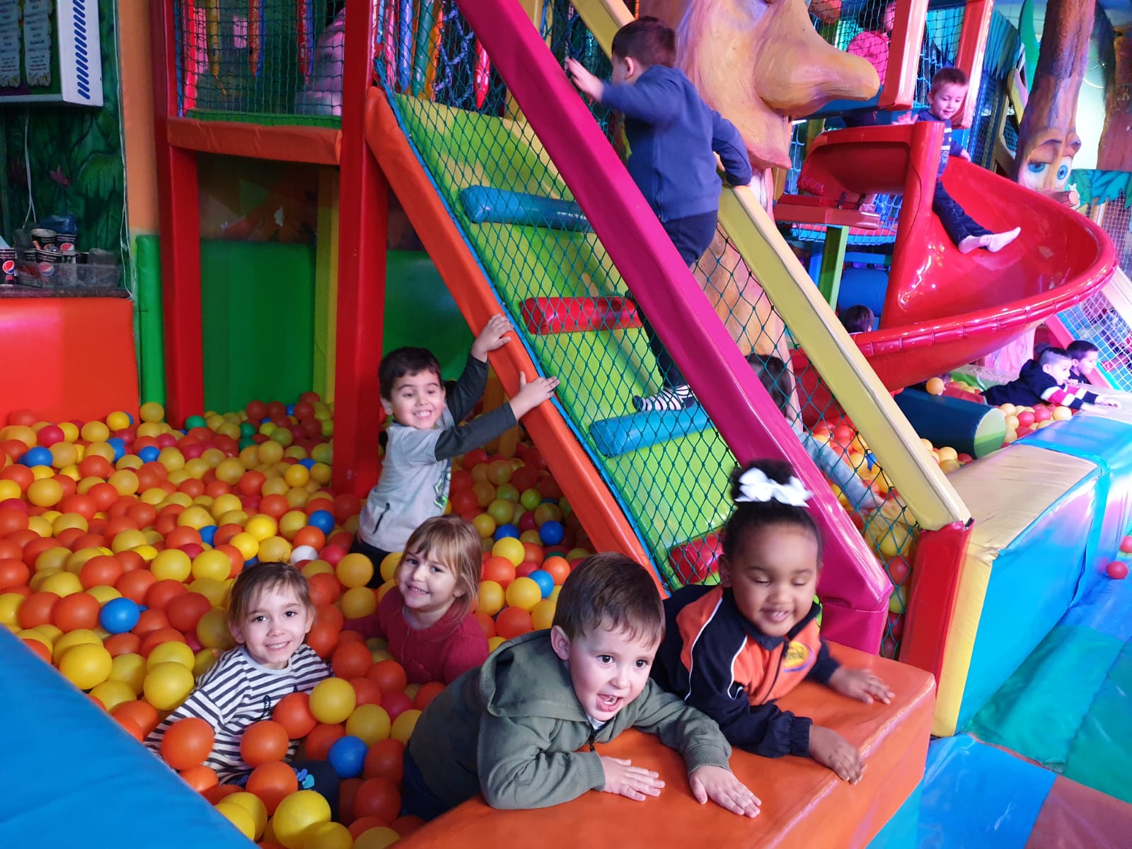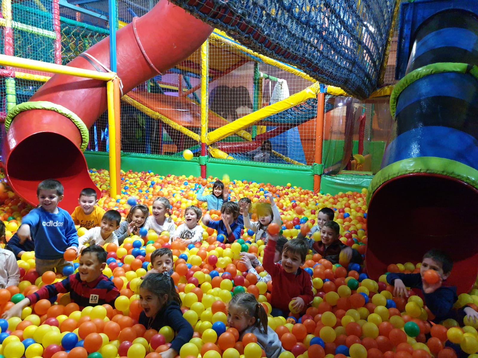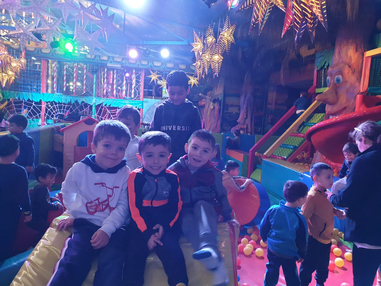 Lo pasaron muy bien compartiendo juegos con nuestros compañeros y profesores en las colchonetas, la casa del terror, la piscina de bolas, toboganes, jugando al fútbol.. Cantamos y bailamos en el escenario.