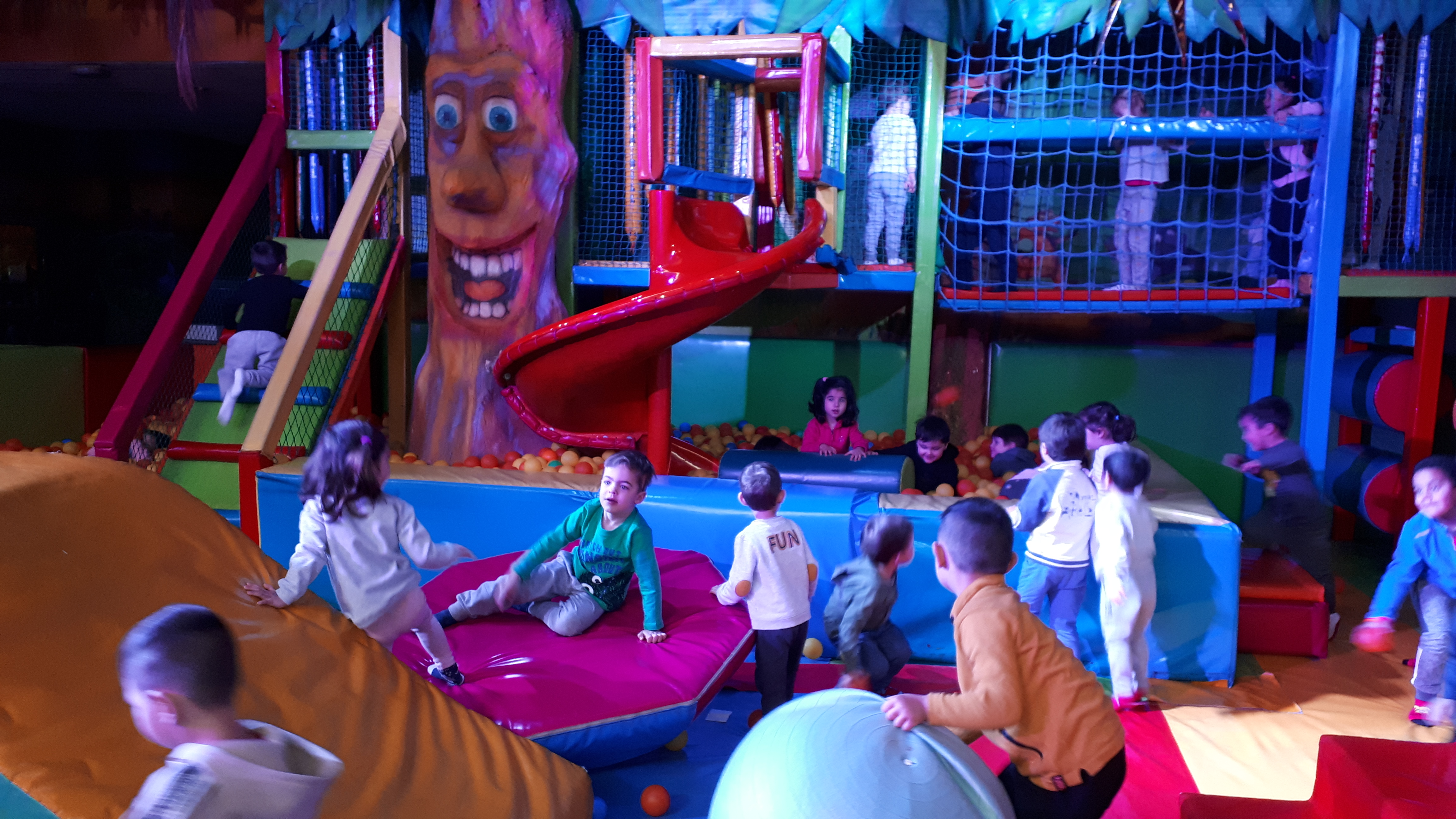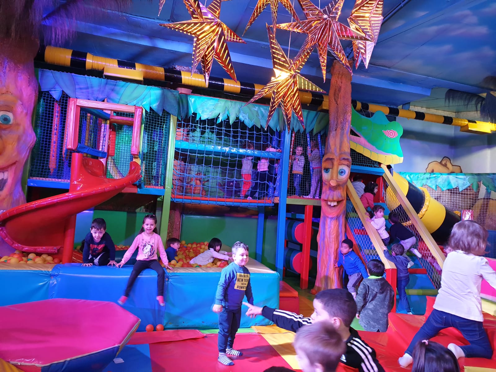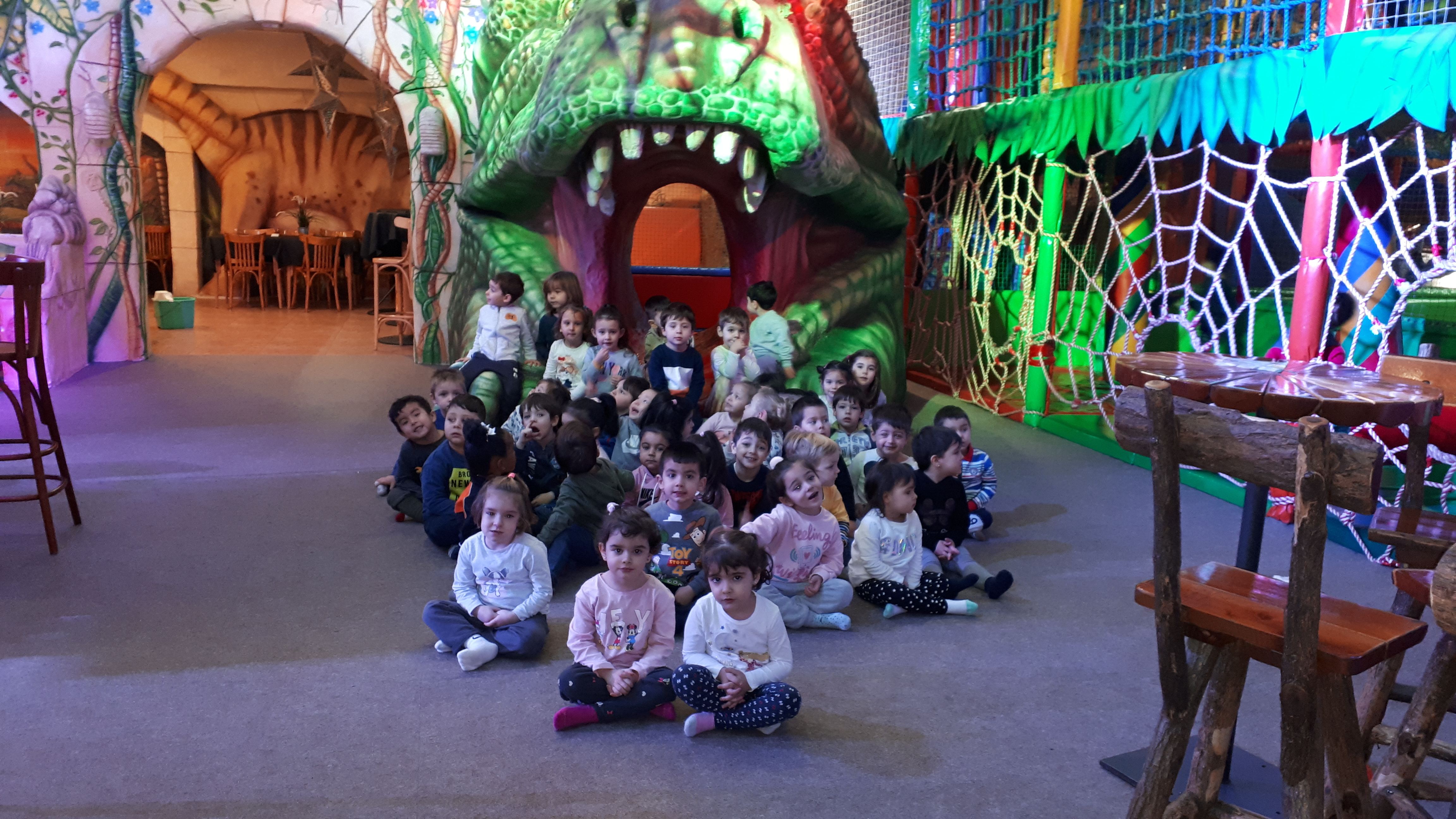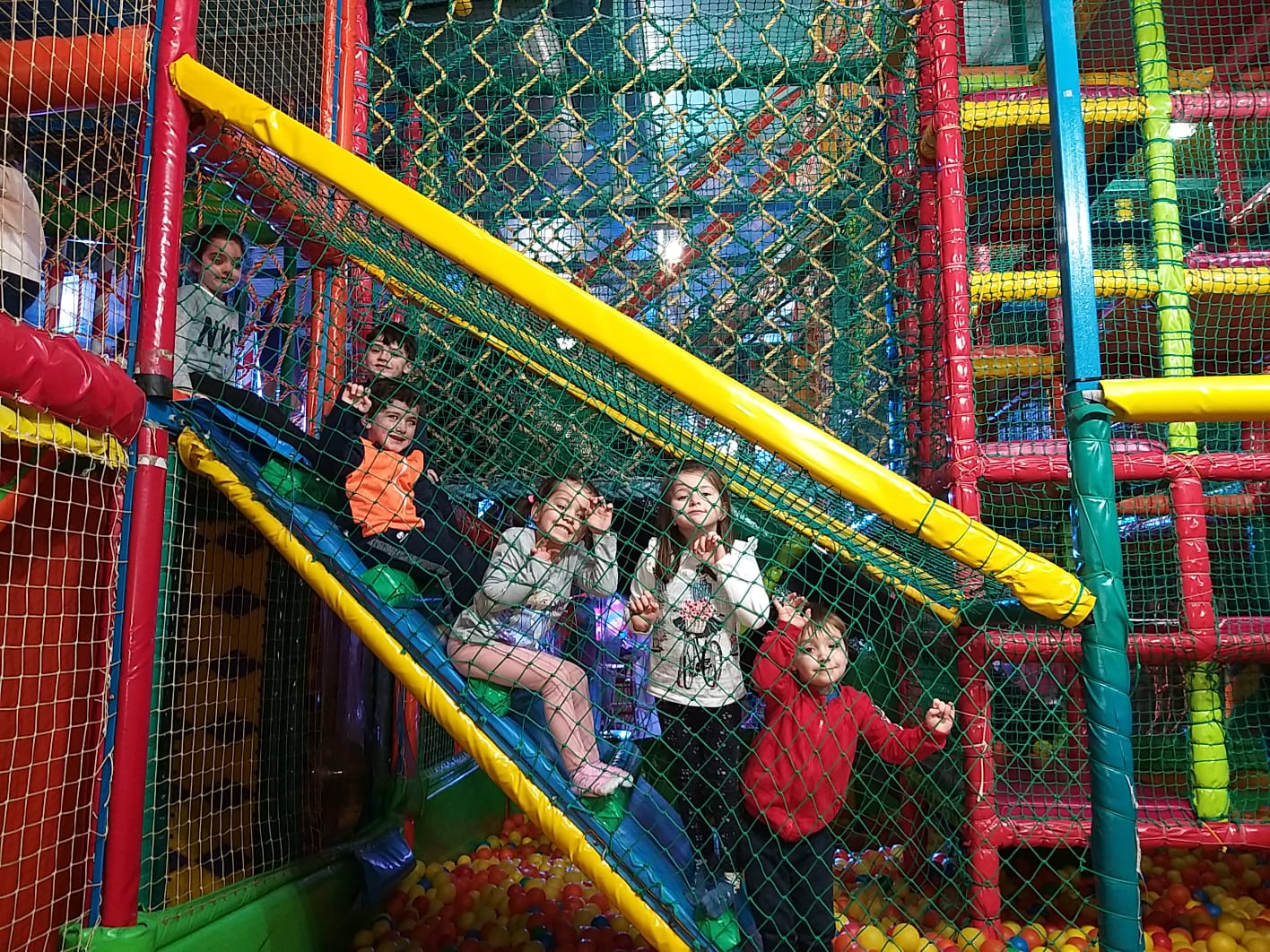 Lo pasaron muy bien compartiendo juegos con nuestros compañeros y profesores en las colchonetas, la casa del terror, la piscina de bolas, toboganes, jugando al fútbol.. Cantamos y bailamos en el escenario.